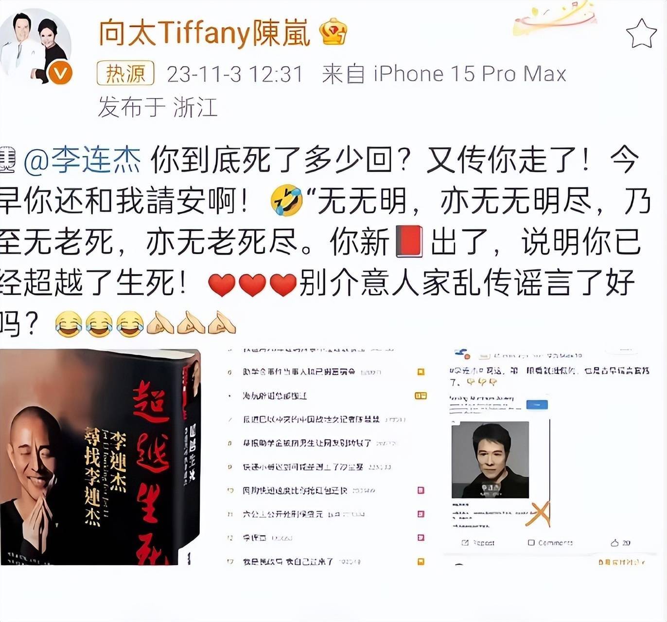 而与李连杰交情深厚的向太也在社交平台打趣为他辟谣。